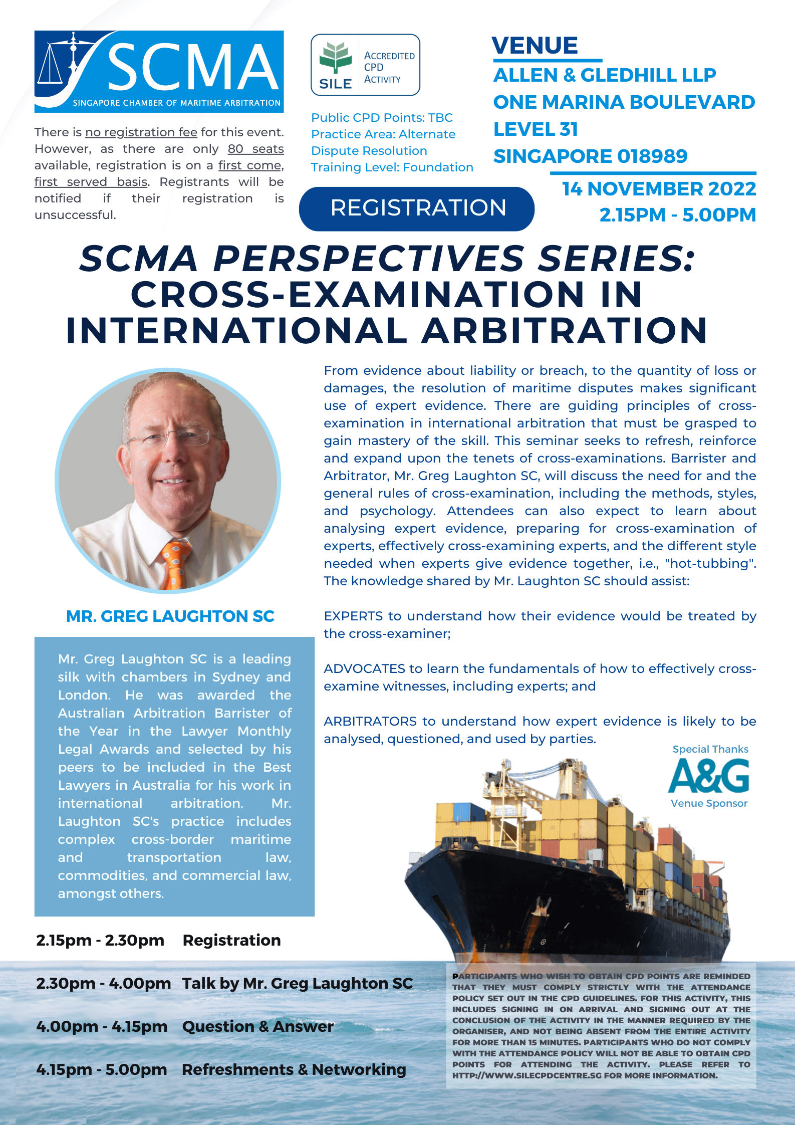 15 November 2022 32 Maxwell Road, Maxwell Chambers, #03-01, Rooms 301 & 302, Singapore 069115 The Singapore Chamber of Maritime Arbitration (SCMA) held its networking reception on 15 Nov 2022 at Maxwell Chambers. The reception served as a platform for SCMA to reconnect with the industry players from the legal and maritime community. We were honoured to have the Guest Speaker for our event, The Honourable Justice S. Mohan, share with us his thoughts on how the maritime and alternative dispute resolution landscape has evolved and the role that SCMA can play. To view the transcript of Justice S. Mohan’s address, please click here. SCMA Perspectives Series: Cross-Examination in International Arbitration (2.15PM - 5.00PM)